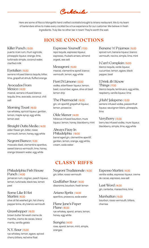 This menu suits a relaxed yet refined atmosphere where diners can enjoy a casual weekday dinner, a lively night out with friends, or a quiet date night. The balance of fresh, well-prepared ingredients and thoughtful drink pairings supports the welcoming vibe of Ariano, making each visit an easygoing experience that feels both familiar and a bit special.